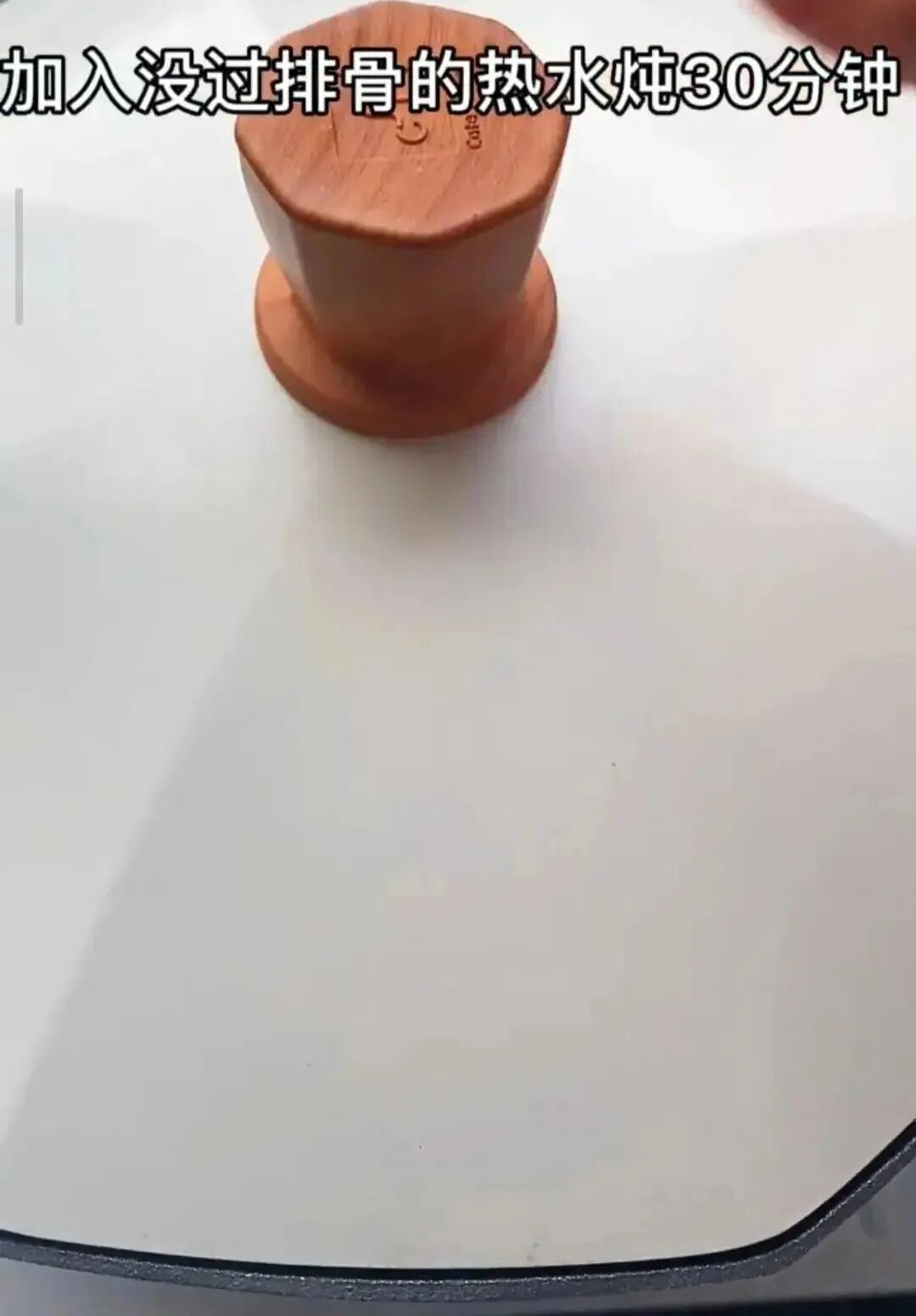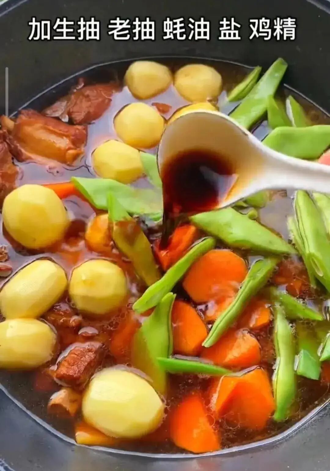 9、炖沸腾的排骨里面加入自己喜欢的配菜,加生抽、老抽、蚝油、食用盐、鸡精,翻炒均匀;