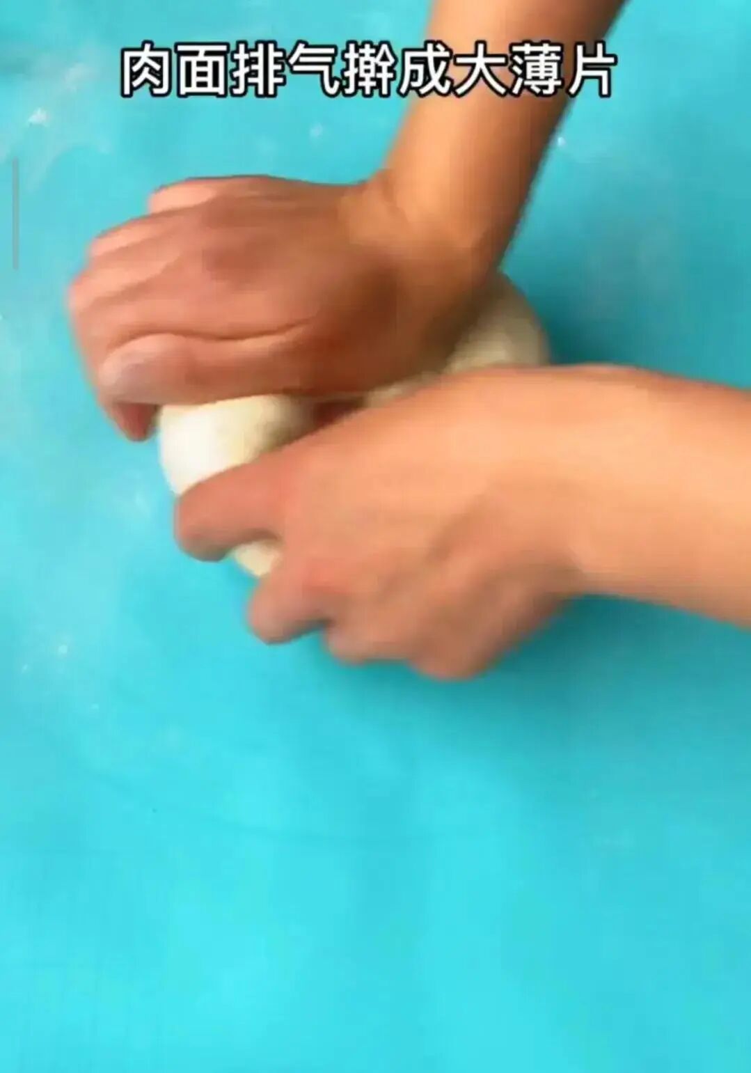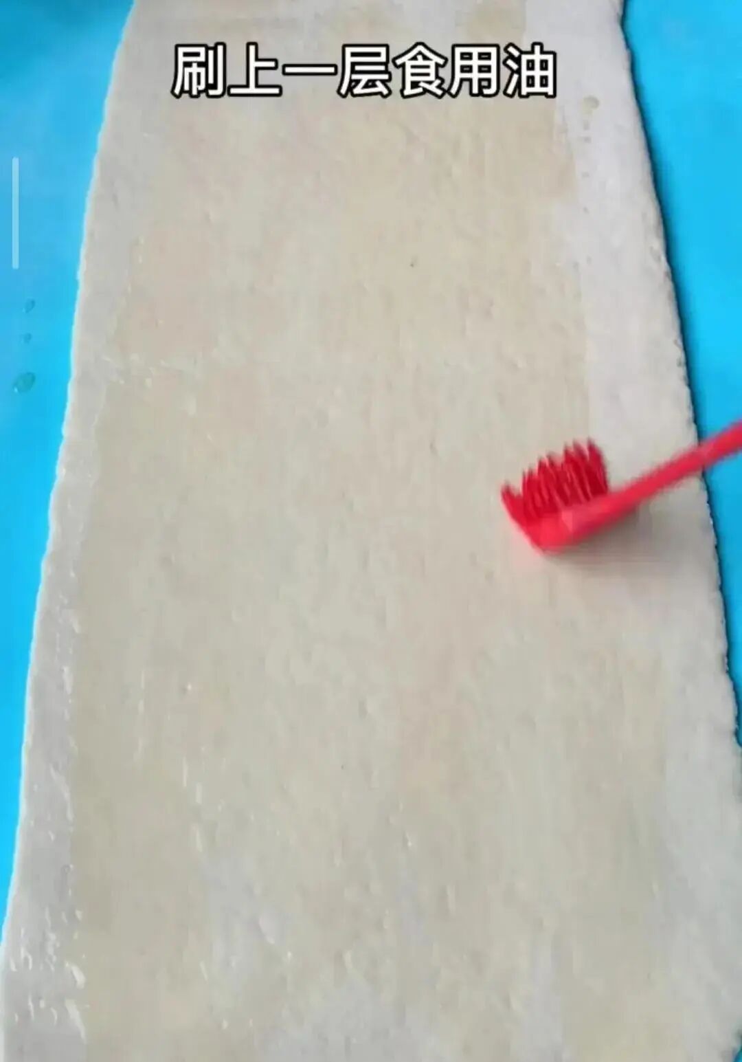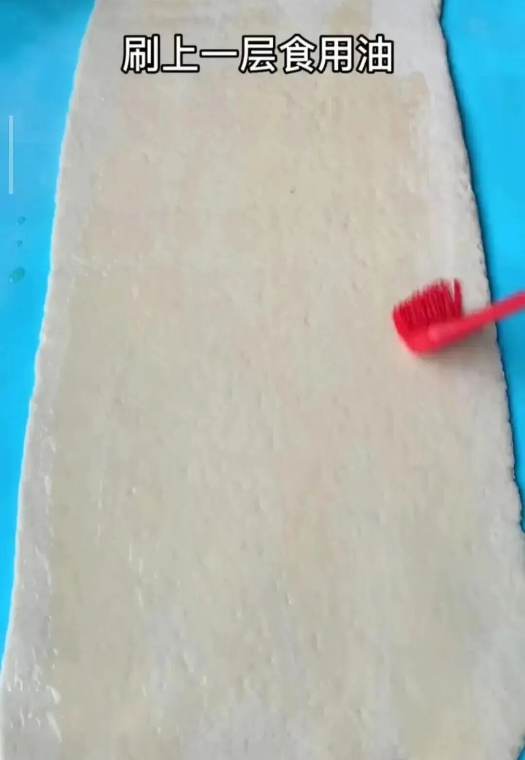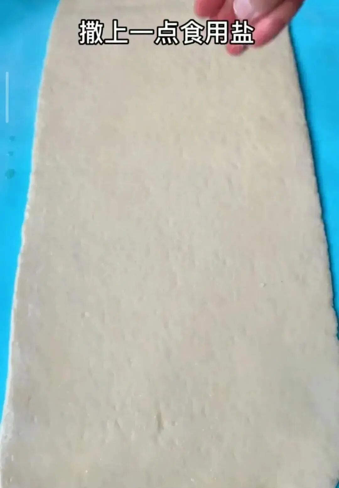 7、将面团揉搓排气之后擀成大薄片,刷上一层食用油,撒上一点儿盐;