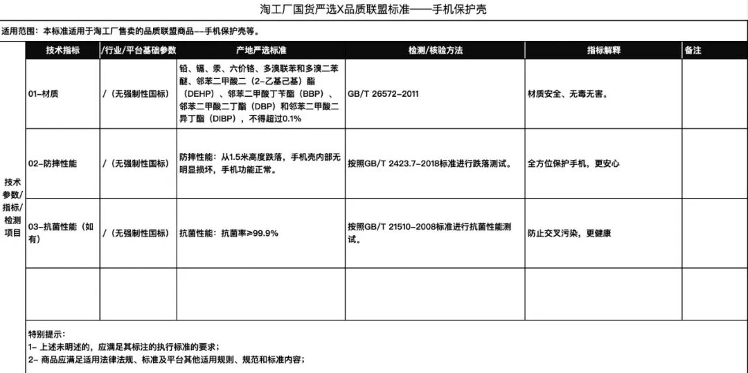 以手机壳为例,淘工厂“国货严选”的标准要求了铅、镉、汞、六价铬等材质不得超过0.1%,以及要求从1.5米高度跌落,手机壳内部无明显损坏,手机功能正常。而且,在抗菌性能上,也明确指出了要大于等于99.9%等。