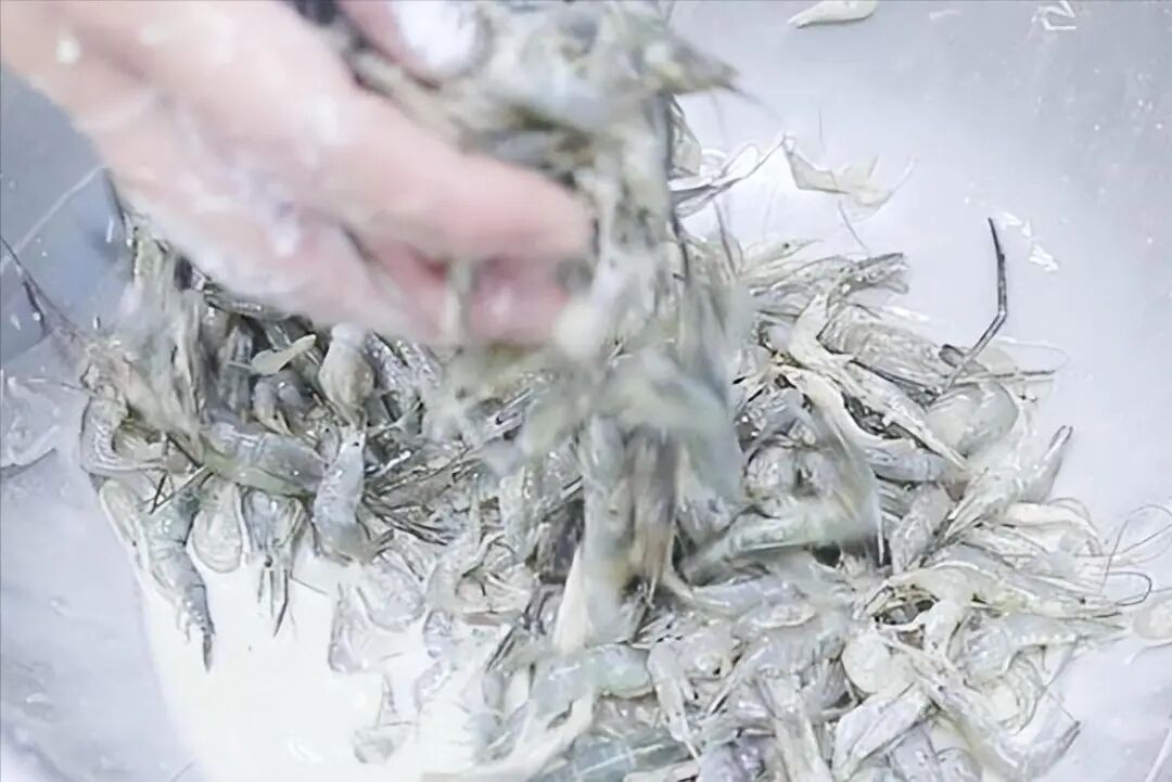 1.新鲜的韭菜摘洗干净、切成段;小河虾仔细清洗干净,加入胡椒粉、鸡粉、料酒、食盐,抓拌均匀腌制10分钟,腌好以后撒上一小把淀粉裹成流水糊。