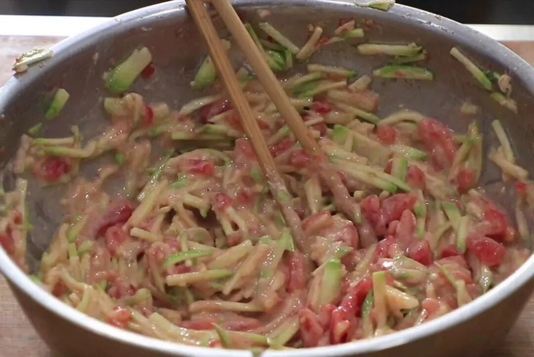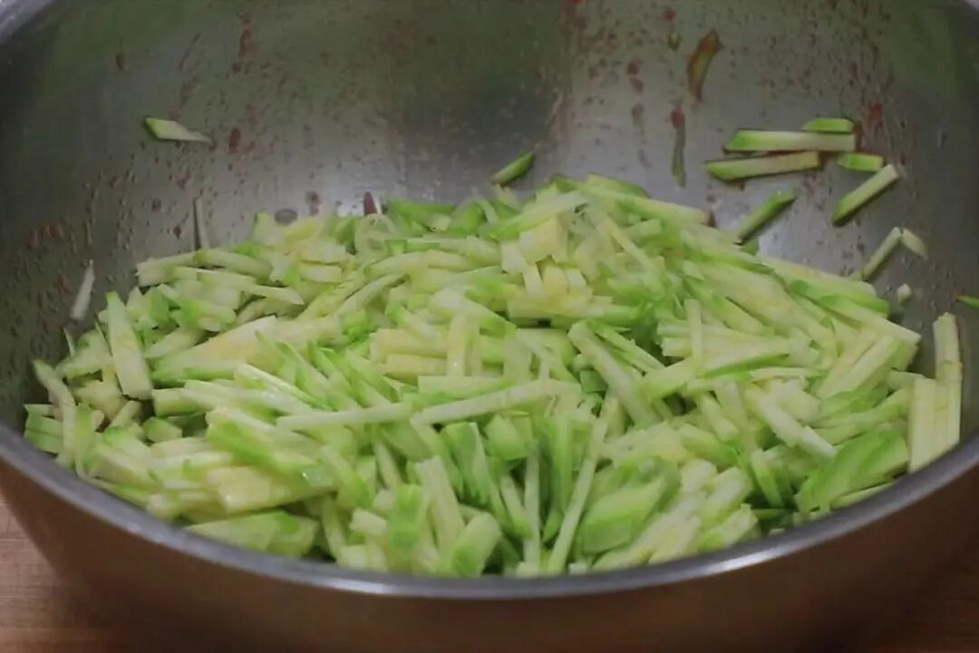 1.番茄上打上十字花刀,放入开水中烫1分钟,剥掉外皮,切成番茄丁;西葫芦洗干净,切成细丝,和番茄放一起,加入食盐2克搅拌均匀,杀出西葫芦中的水分,以免烙制的时候出水,影响口感和卖相,