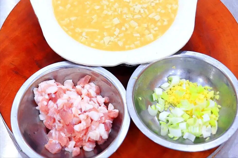 2.准备五花肉一小块,清洗干净切成肉丁;生姜切成末,大葱破开切成葱花备用。