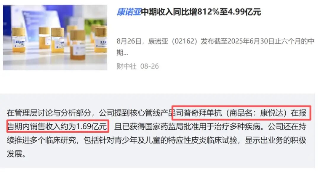 财中社报道,到2025年上半年,司普奇拜单抗的销售额已达到1.69亿元,这一亮眼成绩,不仅证明了药物强劲的市场竞争力,也为康诺亚未来的成长注入了强心剂。