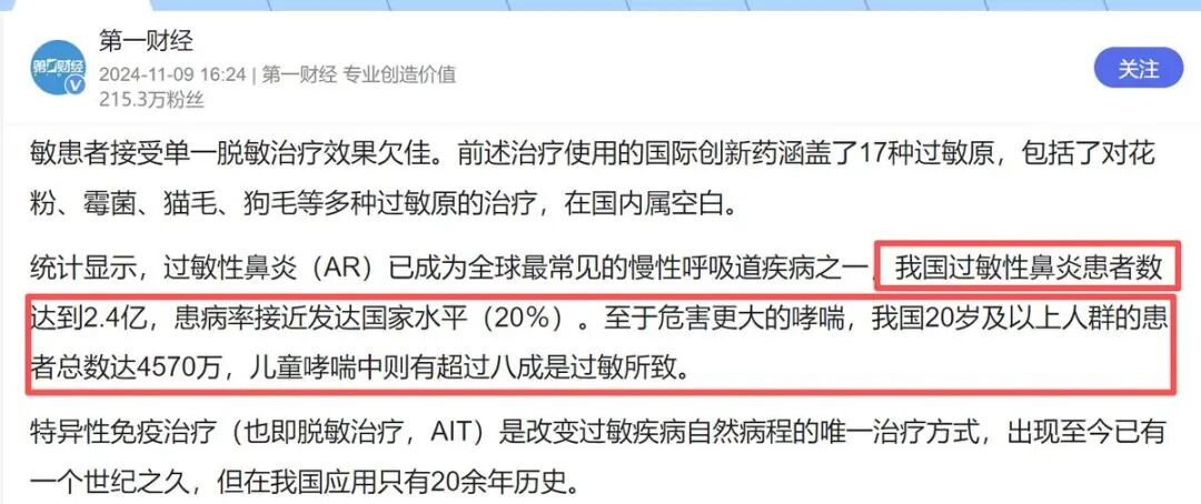 据第一财经报道,中国正在形成一个巨型敏感人群,过敏性鼻炎患者超2.4亿,20岁以上的哮喘患者高达4570万,且儿童哮喘八成根源在过敏。