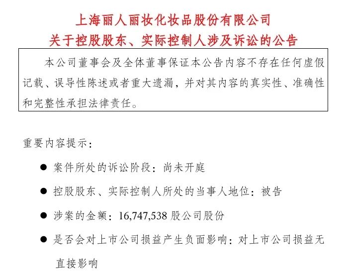 9月29日,丽人丽妆发布公告,控股股东、实际控制人黄韬因涉及离婚后的财产纠纷,收到上海市徐汇区人民法院的举证通知书及应诉通知书,成为被告。 案件中请求将登记在黄韬名下的1674.75万股公司股份过户至其子女黄逸琪名下。当前案件尚未开庭,尚无法判断诉讼结果,因此控股股东、实际控制人权益是否发生变动存在不确定性。