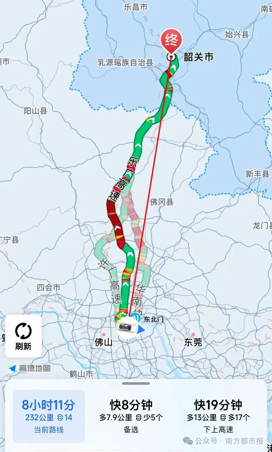今早接近10时 地图显示从广州开往韶关的方向 有一段红色的拥堵 需耗时8小时