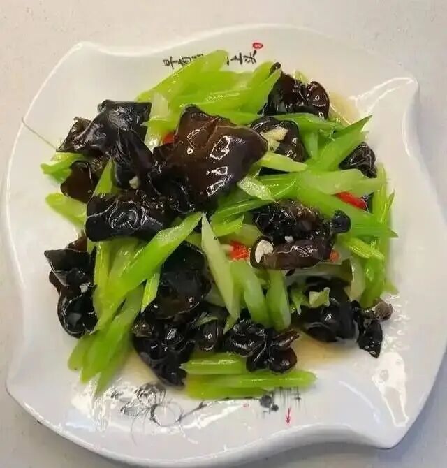 食材:西芹200g、木耳100g、蒜片10g、盐适量、植物油20ml。
