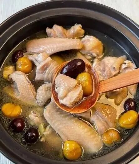 材料:半只鸡、10个马蹄、150克板栗、4颗红枣、2片姜、1根葱、盐适量。