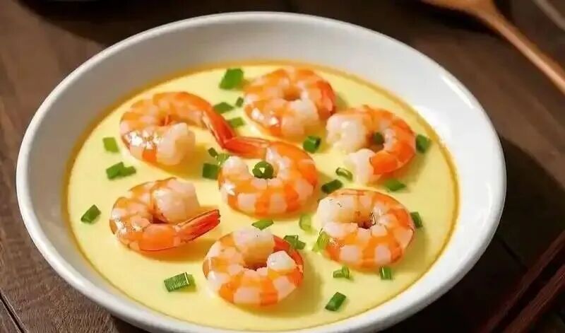 食材:鸡蛋2个、鲜虾10只、温水适量、盐少许。