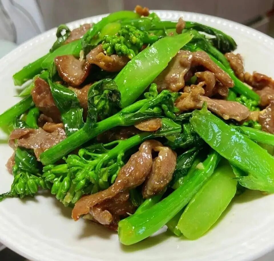 2.油热炒香葱花蒜末,放入肉片,加少许老抽上色,翻炒至断生,放入所有配菜继续翻炒。