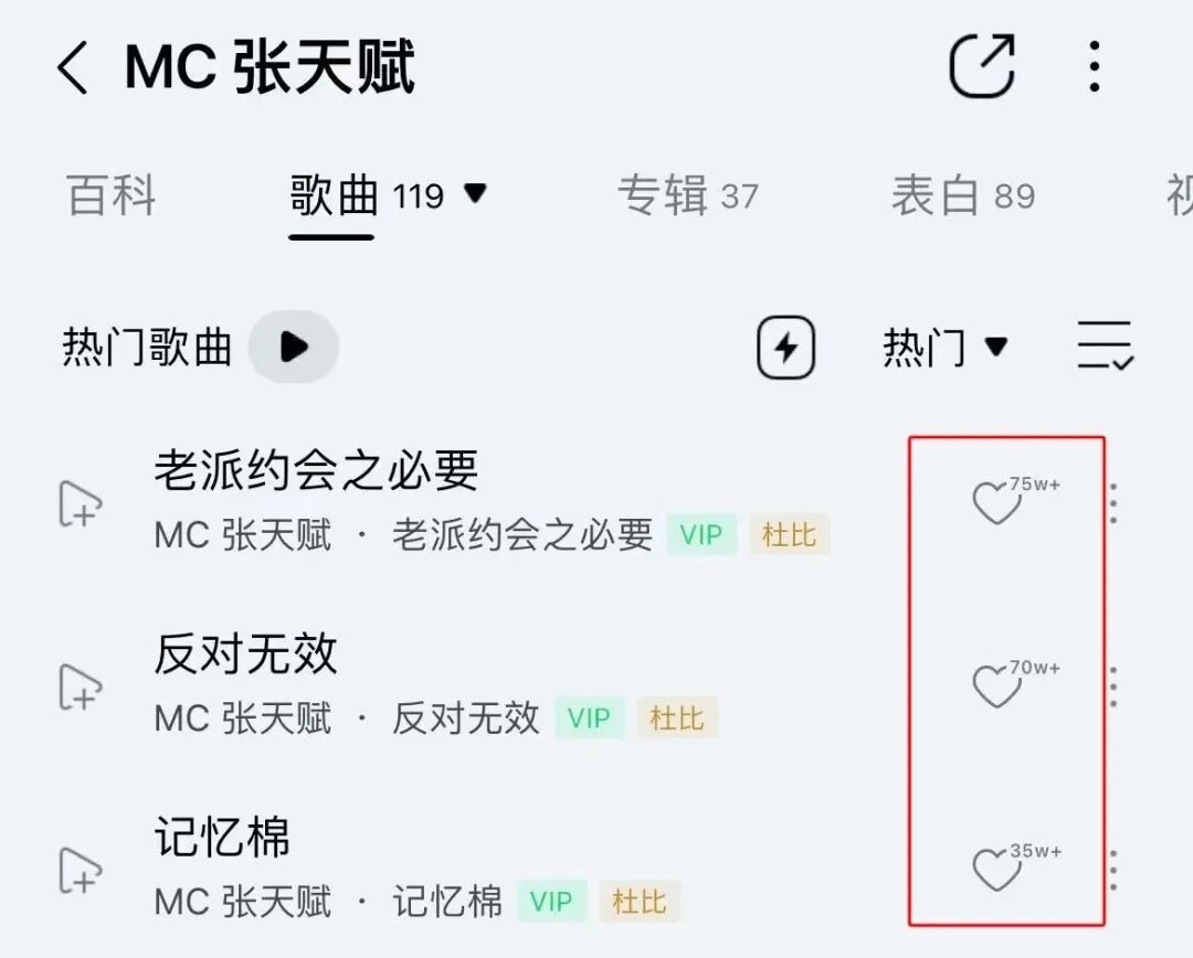 在某音樂軟件上,張天賦的熱門歌曲收藏量最高突破75萬。
