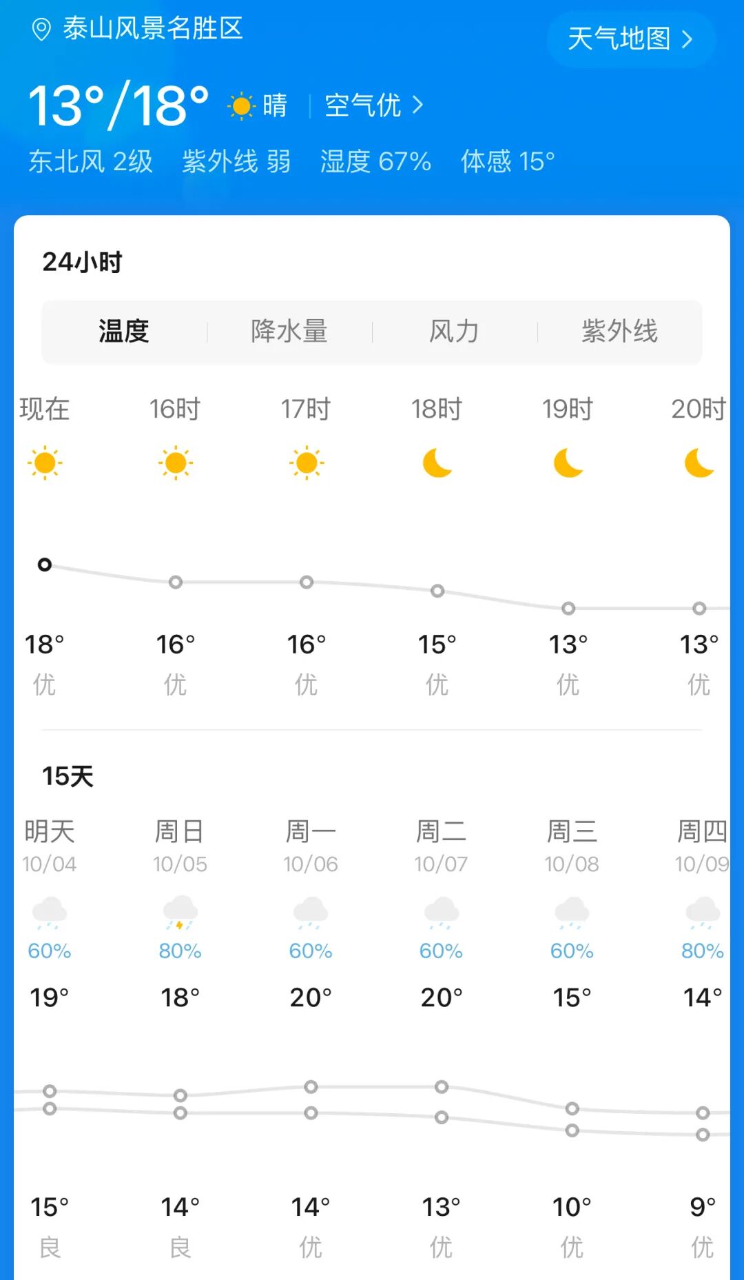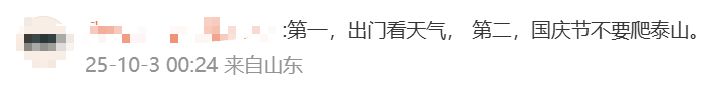 此外,查询相关天气软件发现,泰山景区接下来几天均有雨。10月2日,泰山景区工作人员接受采访时称,国庆假期爬泰山的人流量很大,建议游客选择晴朗天气来此游玩。