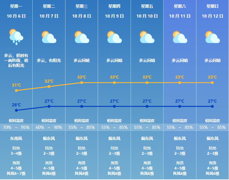 展望假期最后两天,天气都还不错,都是多云有阳光的天气,热情的阳光将带来"热情"的气温,最高气温有33℃,户外活动注意防晒并多补充水分。