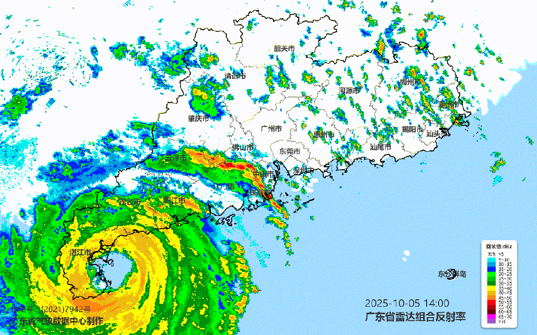今年第21号台风“麦德姆”的中心已于5日14时50分前后在广东省湛江市徐闻县东部沿海登陆,登陆时中心附近最大风力14级(42米/秒,强台风级)。(10月5日14时20分卫星云图)