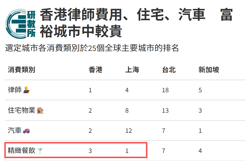 “精致餐饮”的费用,香港是排在第3的位置,排在首位的是上海,着实没想到,上海的“精致餐饮”费用已超过香港。