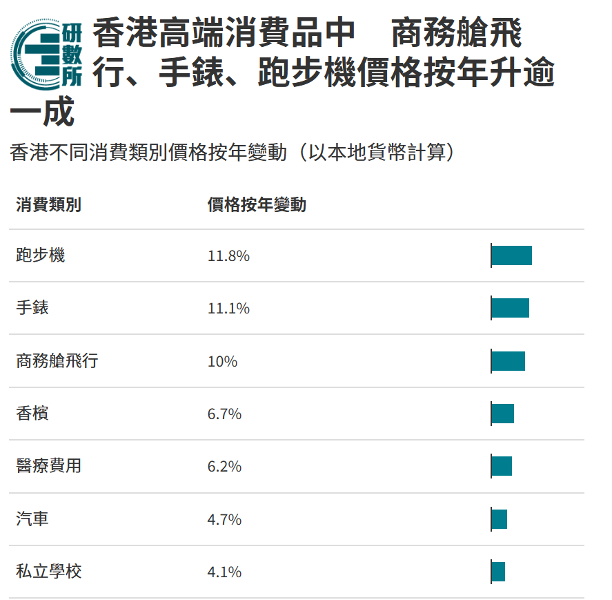 在高端消费品的价格上涨表中,香港上涨10%及以上的有3个,分别为跑步机、手表、和商务舱飞行。