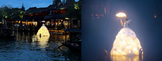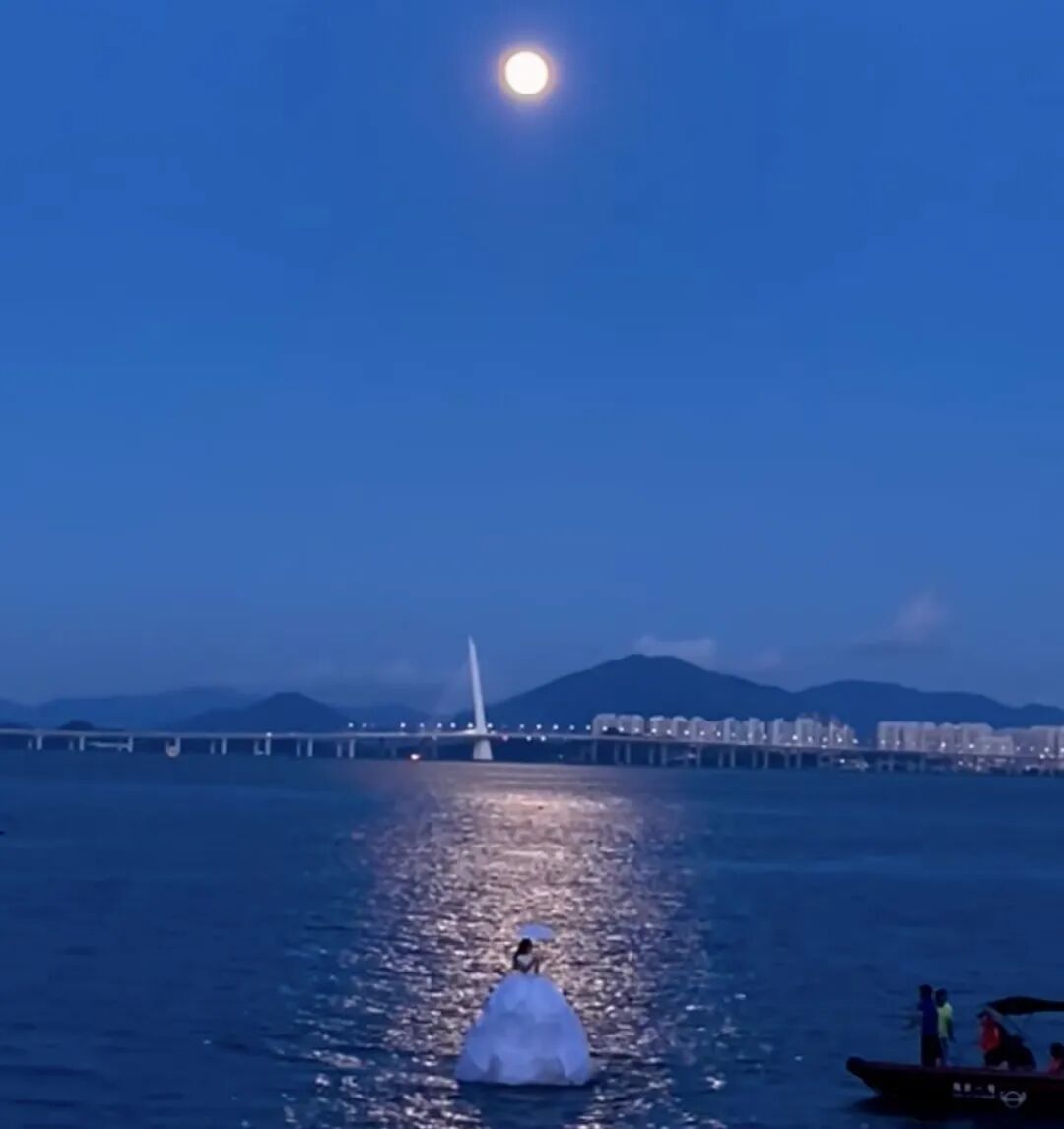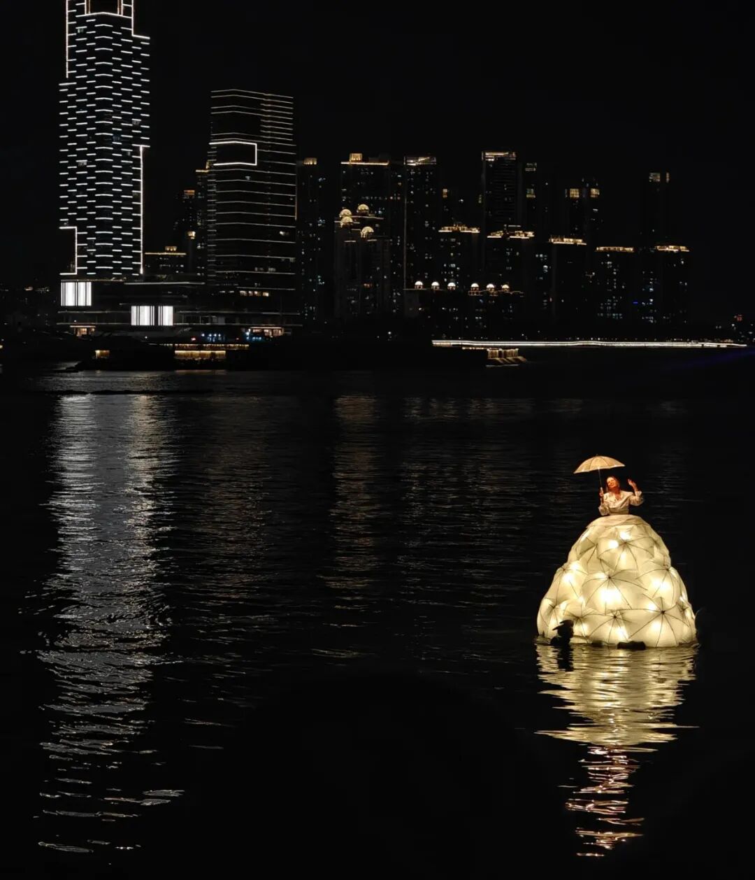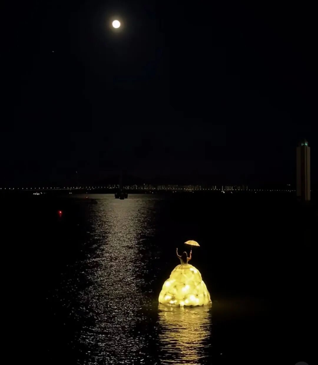 来自荷兰的女歌唱家身着巨大伞状礼服,漂浮于海面,用经典歌剧咏叹调的形式向观众演绎中国经典曲目。 歌唱家的造型灵感来自17世纪的欧洲古典服装和荷兰的水乡风貌,与东方的海滨自然景观和人文环境交相辉映,打造富有诗意的“海上奇观”和中西艺术对话,唤起观众中秋氛围下“天涯共此时”的情感体验。
