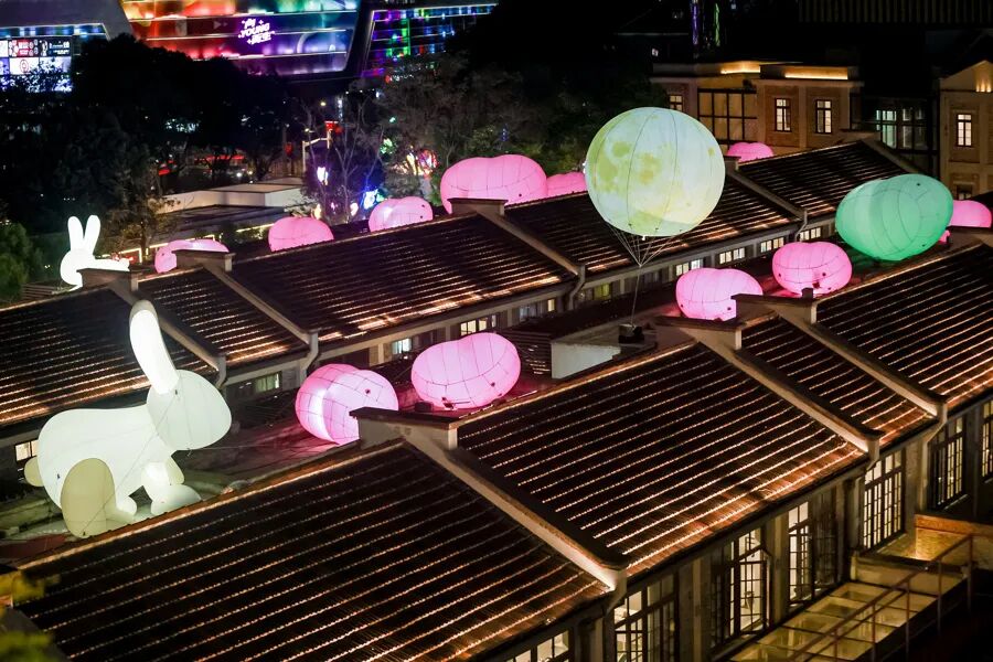 这背后的秘诀就是商场为光影节打造的“瑶台幻梦”光影艺术装置——在海派建筑的屋顶上,一群玉兔在月亮和爱心的海洋里欢腾跳跃。跟随网络种草攻略来打卡拍照的游客,一大批“顺路”走进了粤菜馆。