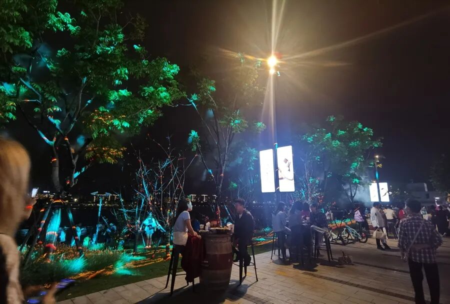比如,西岸南侧的雾森灯光秀,变幻的光影透过水雾和树冠洒在步行道上,吸引家长带着孩子从岸边走入树丛“追光逐影”。没走几步,便能看到奇利斯美式小餐馆独特的酒桶外摆位,落座边吃边看就成了自然而然的事。