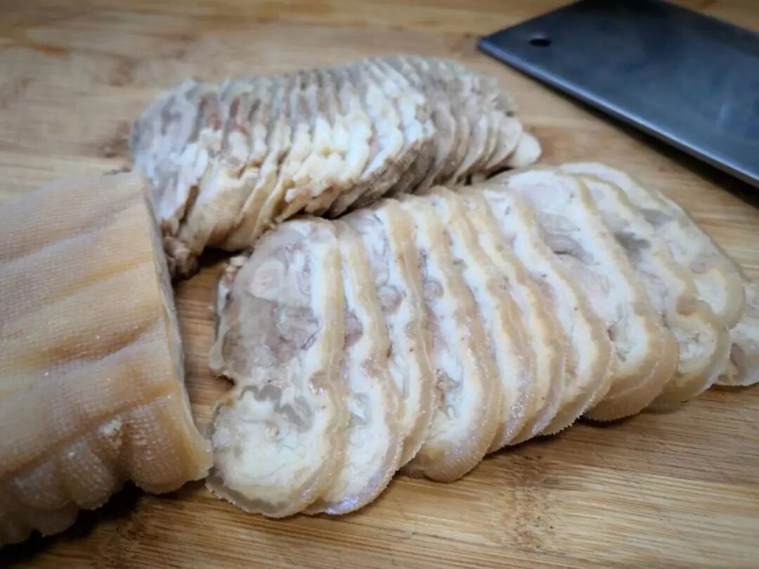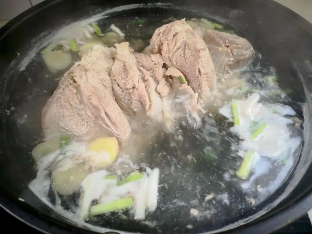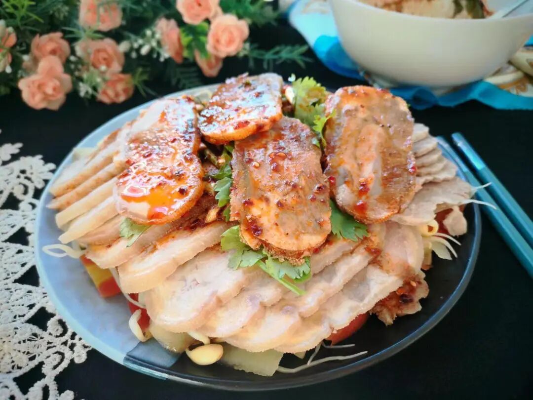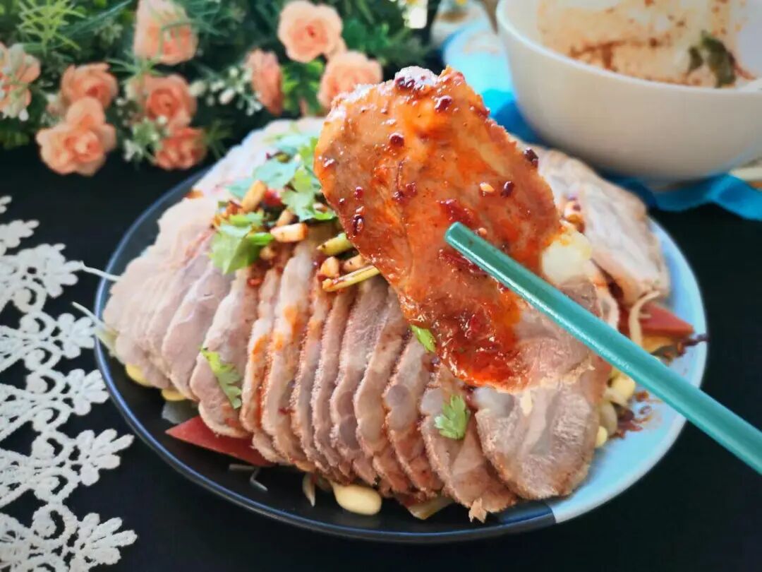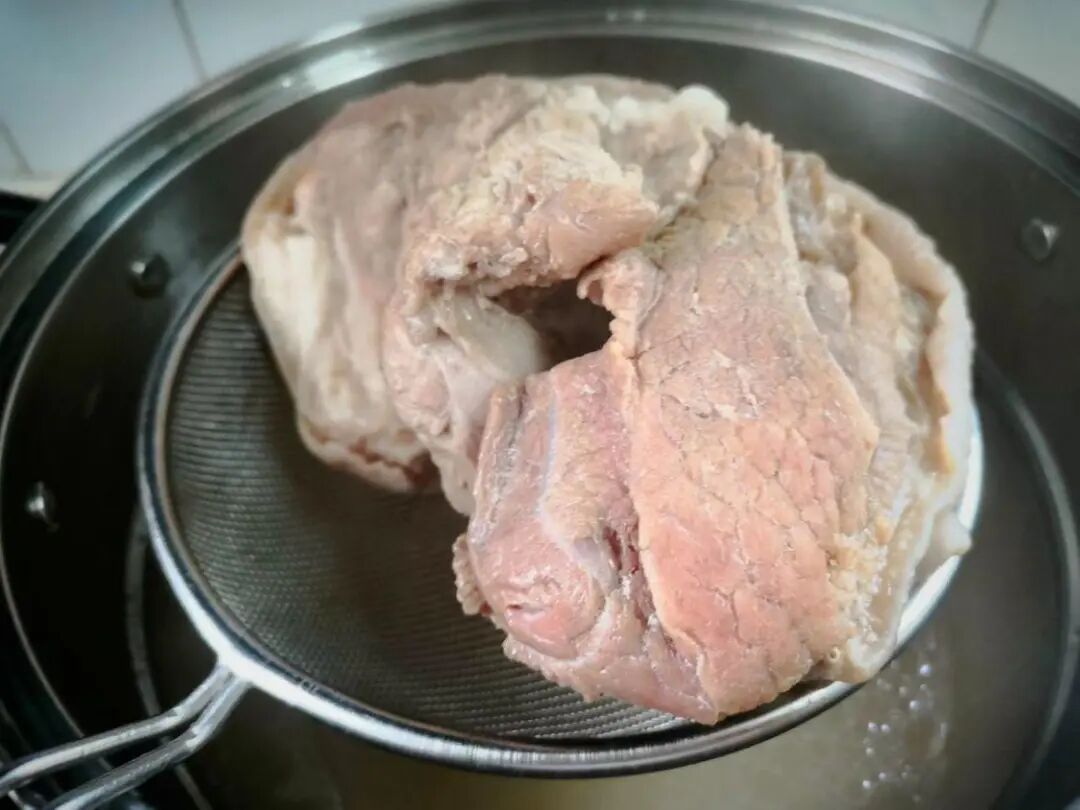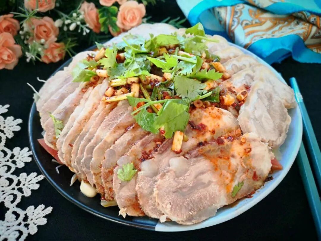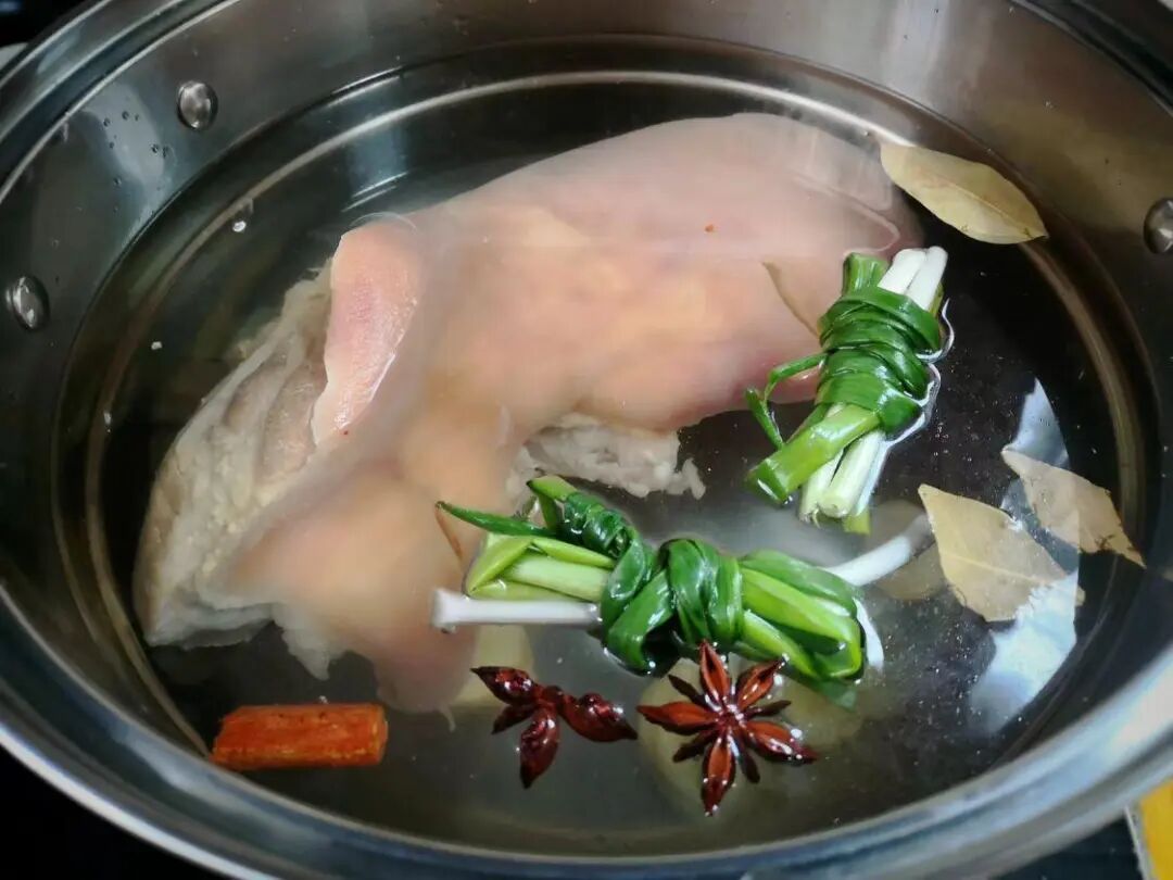 【凉拌肘子】 食材:猪肘、姜、葱、八角、桂皮、香叶、盐、料酒、生抽。 做法: 1、把买回来的肘子烧一下皮和残留猪毛,再刮洗干净,用刀给猪肘子去骨,骨头不用扔掉,用来炖骨头汤喝。 2、肘子肉入凉水锅中,进行焯水去腥,加上几块姜片,一些葱段,再洒些料酒进去去腥,先大火烧开。 3、用勺子将表面浮沫撇掉,再给猪肘子翻个面,使没有煮到的部位再煮一会儿。 4、猪肘子焯好水后,把它捞出来,再用水冲洗几遍洗干净,准备一个深一点的煮锅,猪肘放入锅中,再倒入清水没过猪肘子,加2个葱节,适量姜片,几片香叶,1节桂皮,2个八角,少许料酒,,少许盐和生抽。 5、盖上锅盖,调大火烧开,烧开后转中小火煲2-3个小时,一定要多翻几次面,时间到用筷子扎一下肉最厚的地方,能轻松扎透就可以关火了。 6、将猪肘子稍微晾凉一会儿不烫手,将一张保鲜铺到案板上,放上一张纱布打湿,将肘子肉皮朝下,随后用手将猪肘子卷成一个卷,然后用绳子固定、扎紧。 7、扎好的肘子放在平底的容器上,上面放上一个木板,再放上一个大石头压在上面,压上5个小时或者一夜,会让猪肘子肉压制得格外紧实,还能挤压出多余油脂。 8、放冰箱冷藏几个小时后拆开纱布,一块成型的肉块就好了,用刀切成薄片,蘸上调好的料汁,别提有多香了,真的太好吃了。 9、提前焯过水的豆芽,胡萝卜,菠菜,垫在盘底,上面摆放上肉片,再把调的汁淋在上面,这道好吃的硬菜就做好了,不油腻还入味。