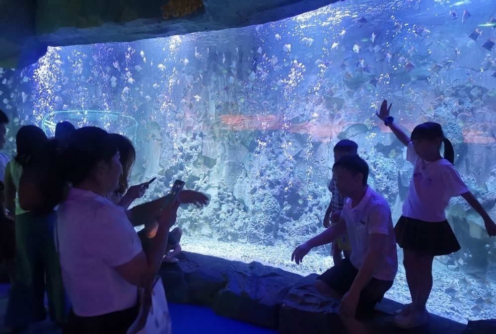 一进入海洋世界,一个巨大的圆柱形水族箱便牢牢抓住游客的目光。色彩斑斓的热带鱼成群游弋,引得孩子们踮脚张望,不时发出“快看这条鱼好大”的惊呼。