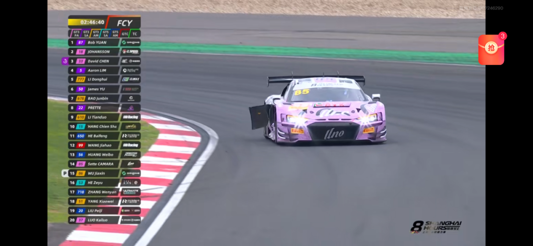 10月8日,上海8小时耐力赛正在进行中。 中午时分,王一博作为85号赛车第二位出发的车手,在对抗87号赛车尝试弯道超车时,遭遇两辆赛车轻微接触。 视频显示,王一博所在的85号赛车右后轮胎与87号赛车轮毂产生剐蹭,碰撞造成赛车右后轮拱及扩散器受损,车胎与车身部件摩擦产生高温随即冒烟。 极目新闻记者注意到,随着赛车前进,85号赛车右后轮胎产生的烟雾越来越大,现场主持人也提到此时赛车存在爆胎风险。 最终,王一博不得不驾驶85号赛车驶入维修区换胎,随后车队车手潘君临顶上。 据悉,事故前王一博已连续驾车90分钟。