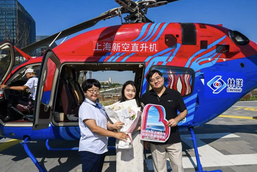 这个假期,低空飞行的“风”也吹到了宝山滨江——在江边的停机坪,由上海国际邮轮旅游度假区携手林洋航空、新空直升机联合推出的国庆直升机 10 分钟飞行体验活动,吸引了不少新婚夫妇、邮轮游客及通过抽奖获得资格的市民参与。