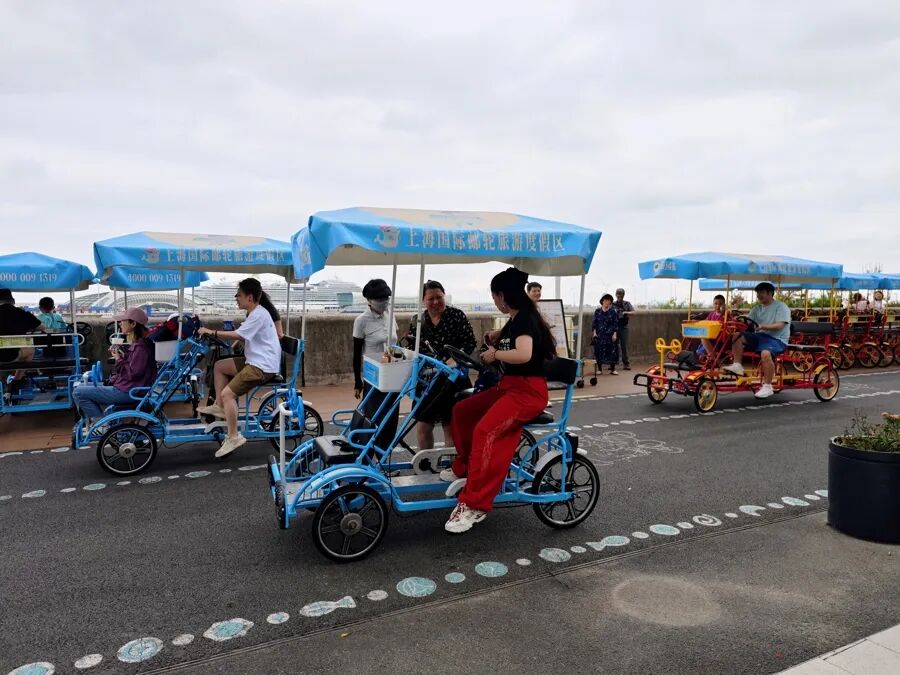 10月8日下午,记者在宝山滨江遇到了乔女士一家。他们在上海·海上世界商场平台区租了四人型休闲自行车,计划边骑行边观光,最后到北边的长滩观光塔打卡。租车行负责人告诉他们,要是前几天来,“江边的人更多,场面还要震撼。”