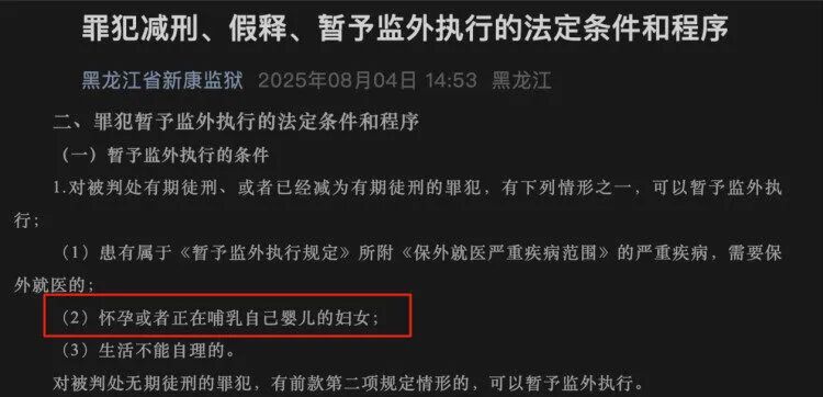 记者梳理司法部门官方公开信息发现,对于孕期和哺乳期暂缓收监的规定,各地执行要求也有所不同。黑龙江新康监狱等司法部门发布的《罪犯减刑、假释、暂予监外执行的法定条件和程序》中均提到,怀孕或者正在哺乳自己婴儿的妇女可以暂予监外执行。而对于暂予监外执行人员持续怀孕的情况,并没有明确说明。