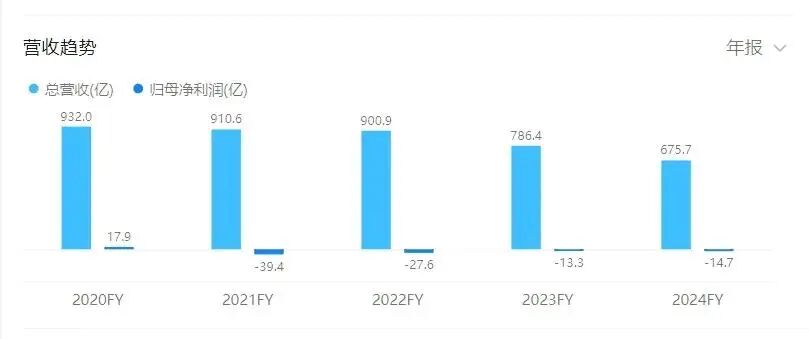 之后,这波颓势就像坐滑梯似的刹不住车,四年连亏不说,营收更是从巅峰期的近千亿暴跌到2024年的675.7亿,硬生生上演了“千亿巨头变青铜”的魔幻剧情。