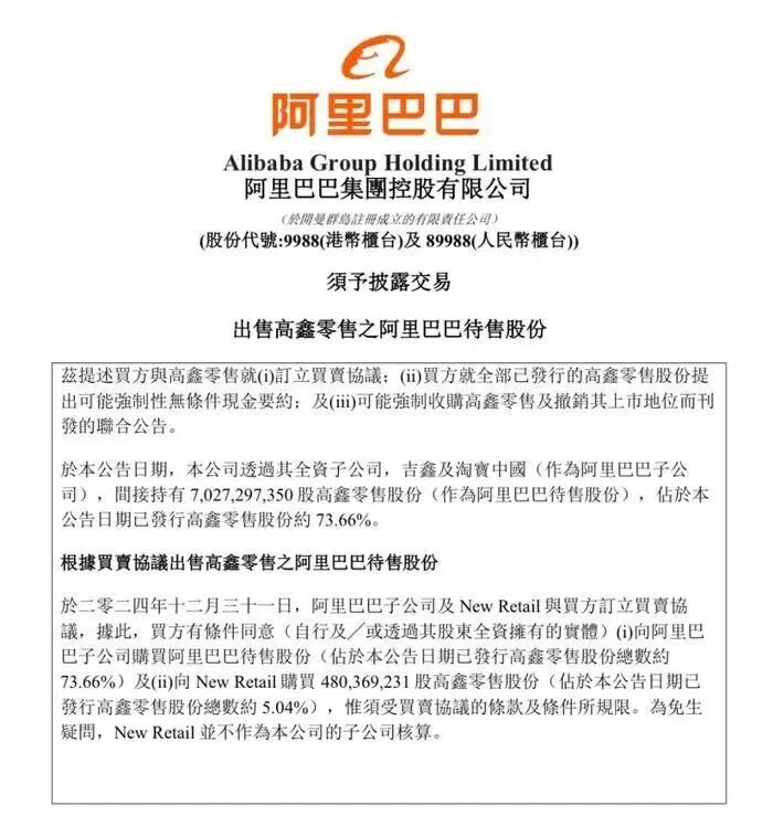 阿里巴巴出售高鑫零售公告️阿里