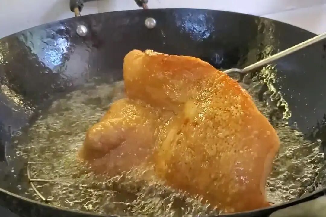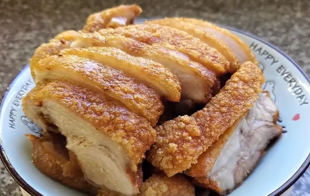 今天给大家分享在我家上桌率最高的一种做法,外皮金黄酥脆,里面肉质细嫩,香而不腻,大人小孩都喜欢。 做法: 1,准备好一个肘子放到燃气灶上用小火烧一下,烧掉表面残留的猪毛,再用刮刀刮一刮最后用流水冲洗干净。 2,清洗干净的肘子沿着骨头切上一刀,慢慢的把骨头剔除。 3,剔除骨头的肘子冷水下锅,加入姜片,料酒去腥,水开后撇去浮沫,加入食盐煮30分钟。 4,煮好的肘子用筷子轻轻一扎就透,捞出过一下凉水浸泡5分钟左右泡透。 5,泡好的肘子擦干表面的水分,锅中放入一个架子猪皮朝下放入肘子,倒入食用油没过猪皮即可,盖上一个盖子防止油飞溅烫伤。 6,油锅里噼里啪啦的声音停止后开盖翻面,继续小火慢炸2分钟左右 。 7,升高油温放入肘子继续大火复炸1分钟,炸到表面金黄酥脆即可出锅晾凉。 8,炸好的肘子晾至温热切成小片装盘就可以享用了,也可以再调一个自己喜欢的料汁更加美。