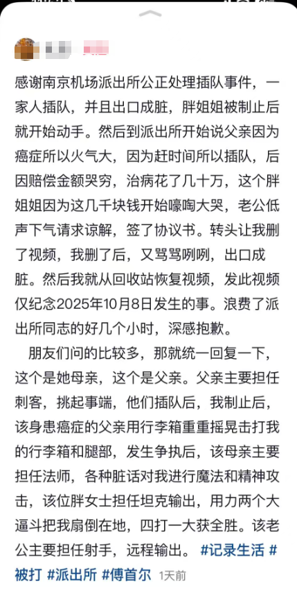 10月8日,南京禄口机场一名乘客发视频称,在值机排队时遇人插队,上前阻止后被对方辱骂并扇耳光。