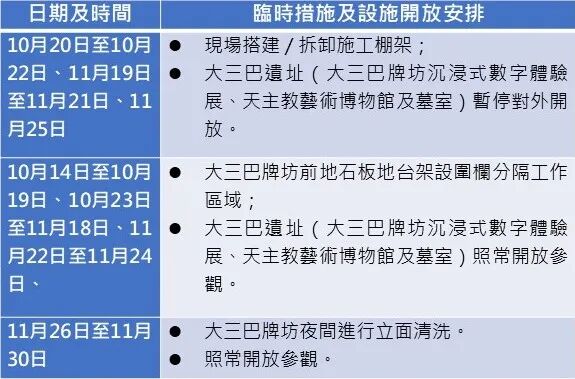 其间,大三巴牌坊正立面将会设置施工棚架;因应施工需要及保障公众安全,大三巴牌坊(包括遗址内的“时空穿梭‧游历三巴"大三巴牌坊沉浸式数字体验展、天主教艺术博物馆及墓室)将于部分时段暂停对外开放(详见上表)。施工期间大三巴牌坊前地的石板地台将设置围栏分隔工作区域,敬请公众留意,查询可于办公时间致电2836 6320。