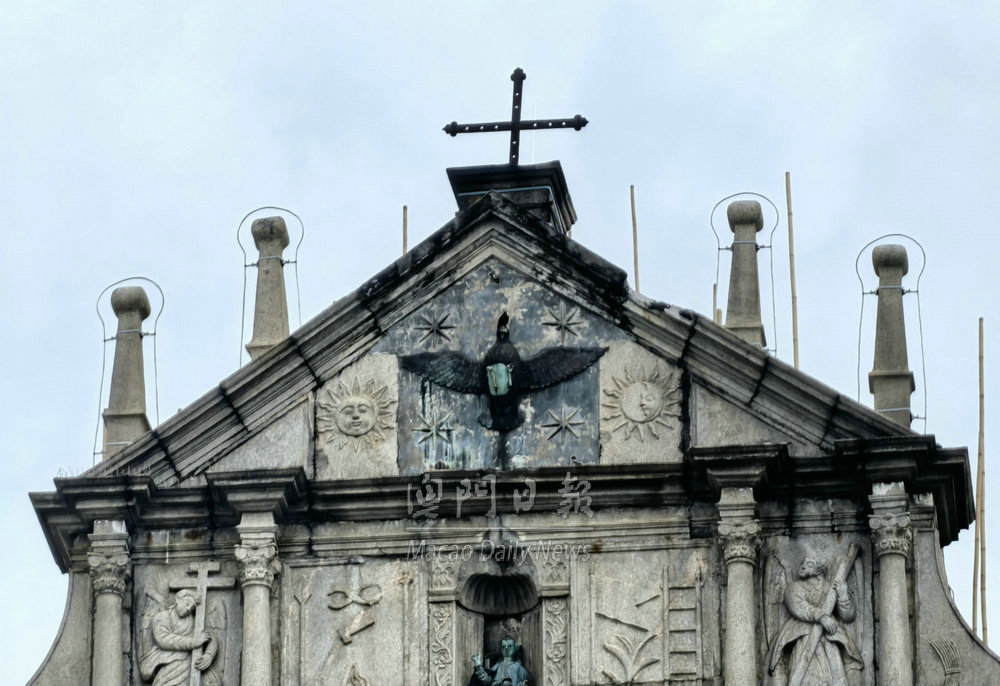 为对大三巴牌坊铜像进行必要的维护保养,文化局分阶段对立面上的七个铜像进行修复。首阶段第三层的圣母像及石基座修复工作于今年6月完成,现按照已公布的修复计划,将于10月中旬至11月期间,实施第二阶段第二层四个铜像的修复工作。