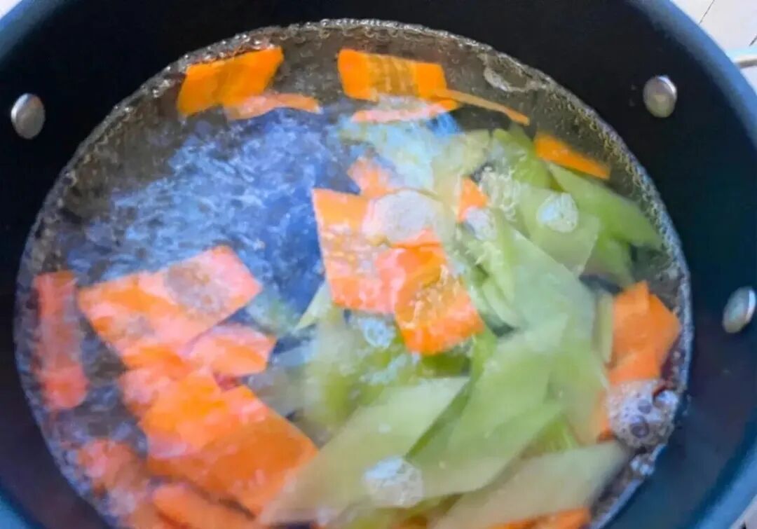 放入莴笋片、胡萝卜片焯水1分钟捞出
