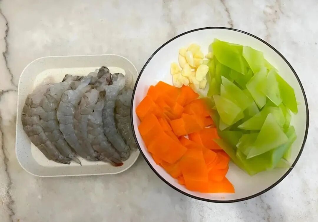 食材:鲜虾、莴笋、胡萝卜、蒜