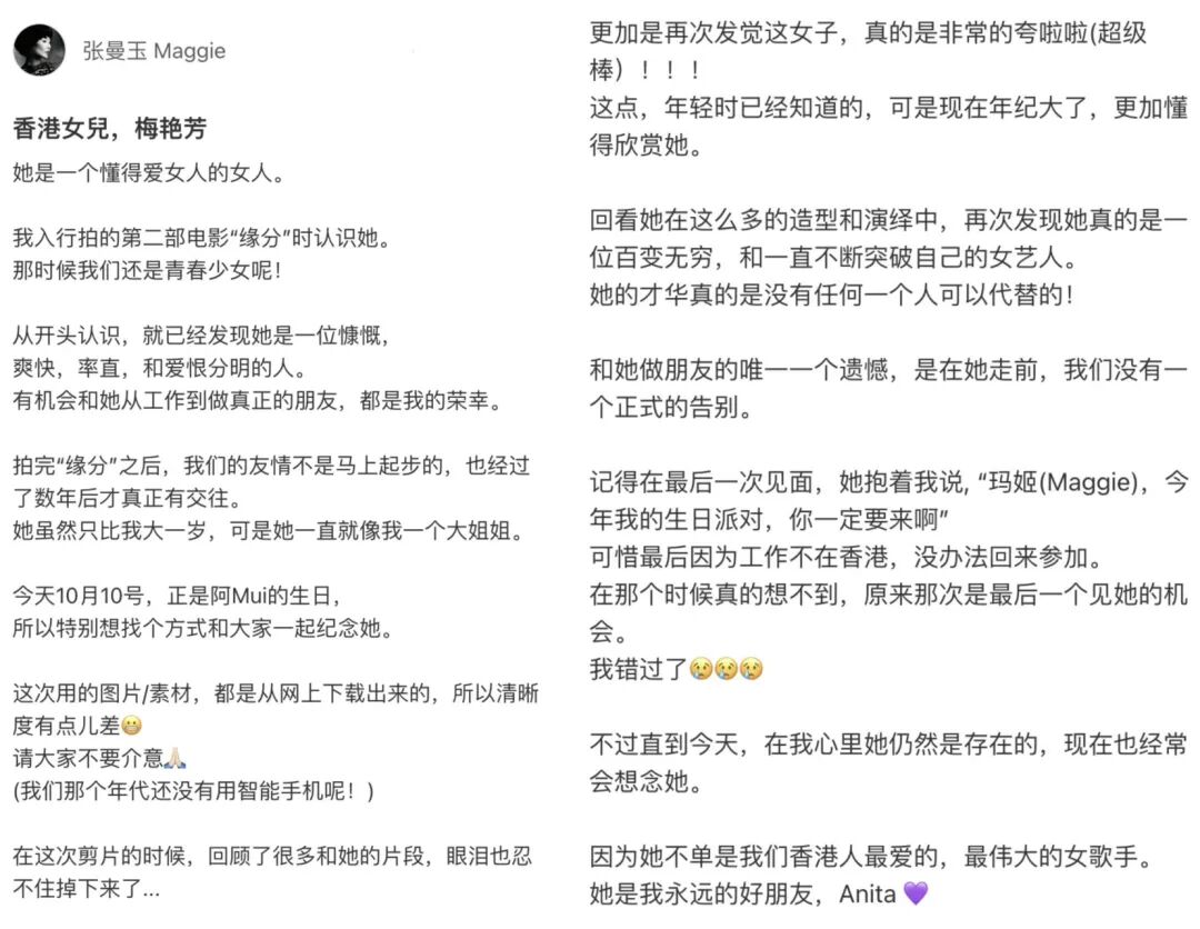 昨天,是梅艳芳诞辰日,女星张曼玉在个人社交平台发布