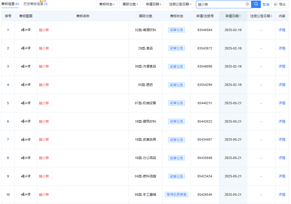 红星资本局通过天眼查App注意到,今年以来,宏胜集团已申请数十个“娃小宗”相关商标,国际分类包括啤酒饮料、食品、方便食品和医药等,部分商标已通过初审,部分商标还在等待实质审查。