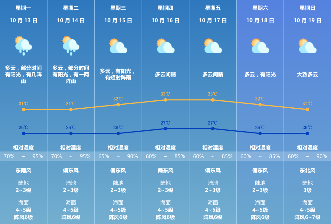 珠海未来7天天气预报 珠海市气象台预计,12-14日我市云量增多,间中有阵雨;15-18日以多云到晴为主。