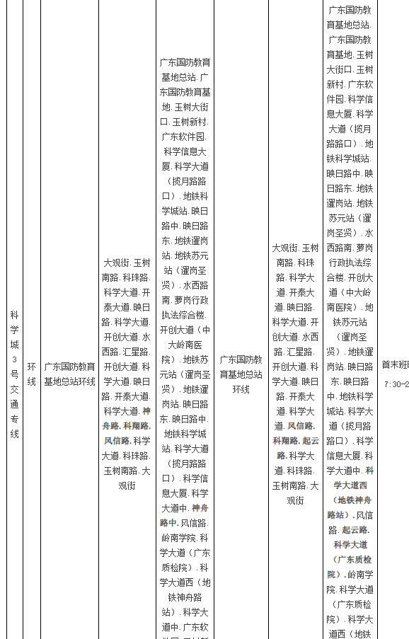 公共汽车科学城3号交通专线由行经神舟路、科翔路、风信路等路段调整为行经风信路、科翔路、起云路等路段,公共汽车582路班车同步暂停运营。