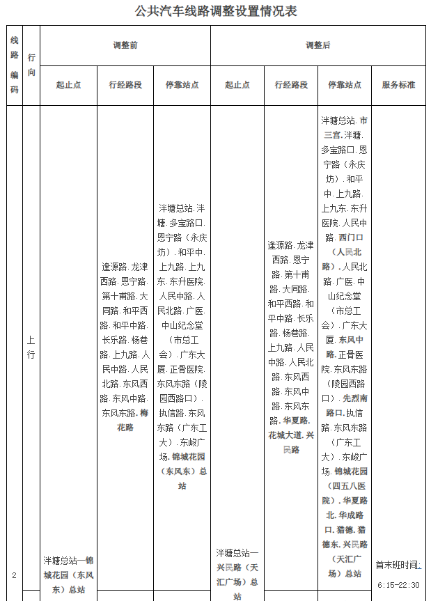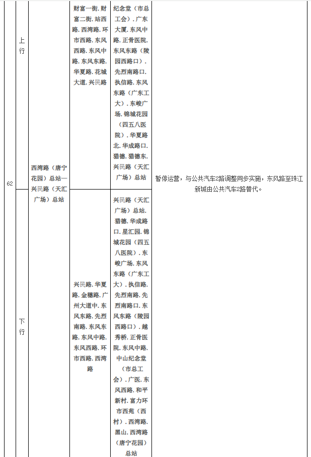 公共汽车2路由泮塘总站至锦城花园(东风东)总站调整为泮塘总站至兴民路(天汇广场)总站,公共汽车62路同步暂停运营;