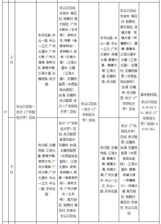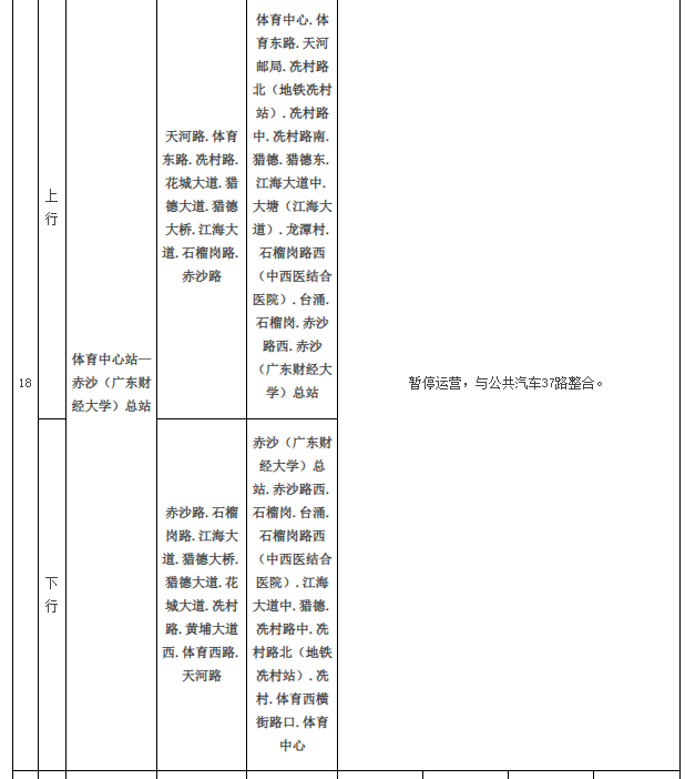 公共汽车37路由行经广州大桥、广州大道南、客村立交、新港中路等路段调整为行经花城大道、猎德大道、猎德大桥等路段,发班间隔调整为高峰期不大于10分钟一班,平峰期不大于15分钟一班,公共汽车18路同步暂停运营。