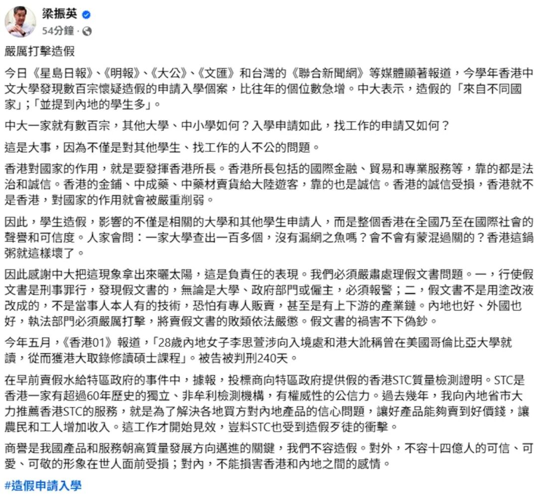 梁振英怒斥:假文书祸害不下伪钞,香港诚信岌岌可危面对假学历事件的升级,梁振英于10月12日晚在Facebook发文,措辞严厉,形容此事为“关系香港未来的大事”。他指出:“香港的国际金融、贸易和专业服务等领域,赖以生存的正是法治和诚信。假文书的泛滥,严重侵蚀了香港的信誉基础,香港的诚信受损,香港就不是香港。” 梁振英进一步强调,假学历不仅影响高校正常招生秩序,更是对整个香港社会声誉的巨大打击。“这锅粥一旦坏了,受害的将是所有守法守信的香港人。”他呼吁执法部门必须严厉出击,不论买家还是卖家,都要依法严惩。他更直言:“假文书的祸害不下伪钞,必须零容忍。”