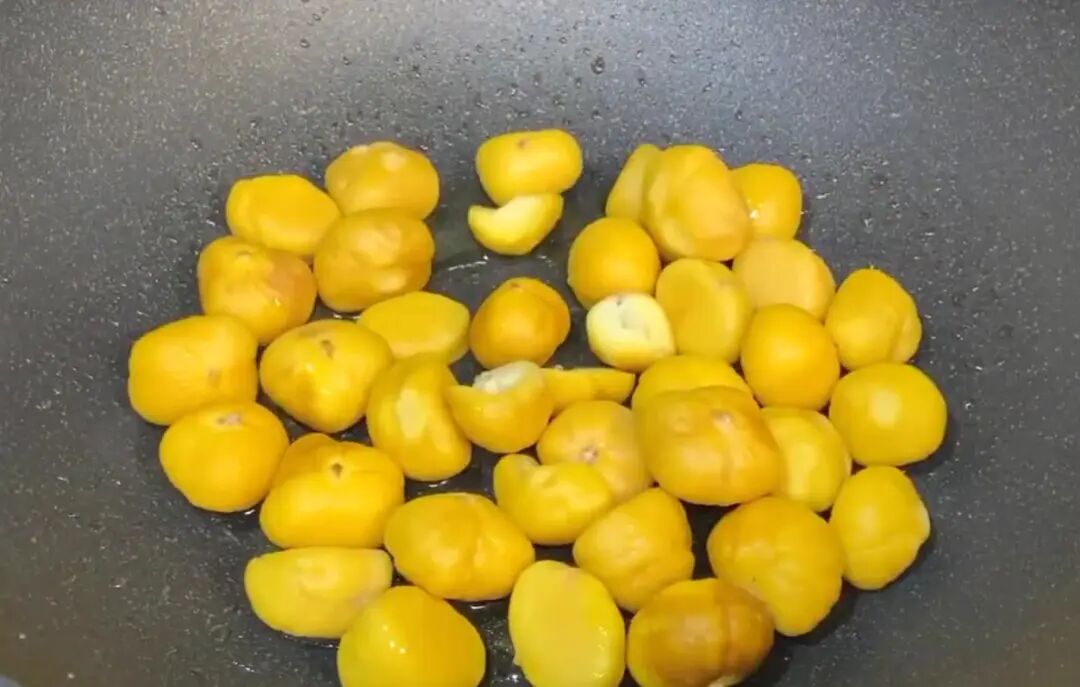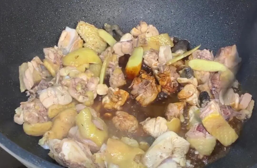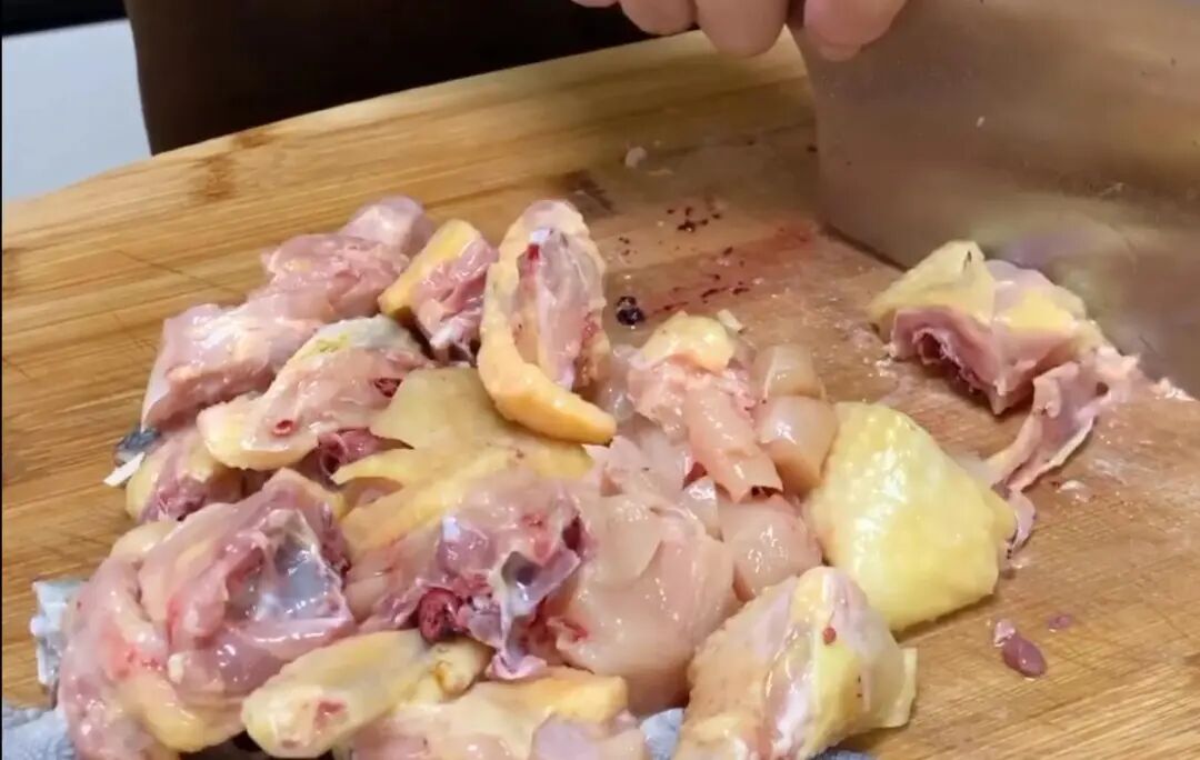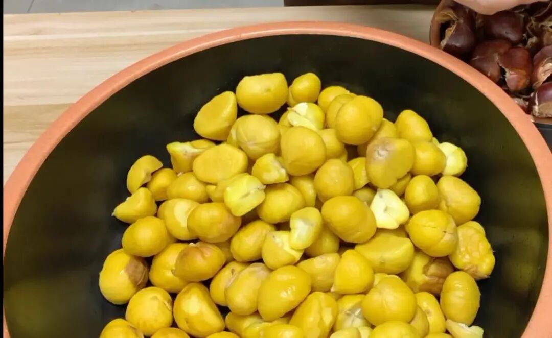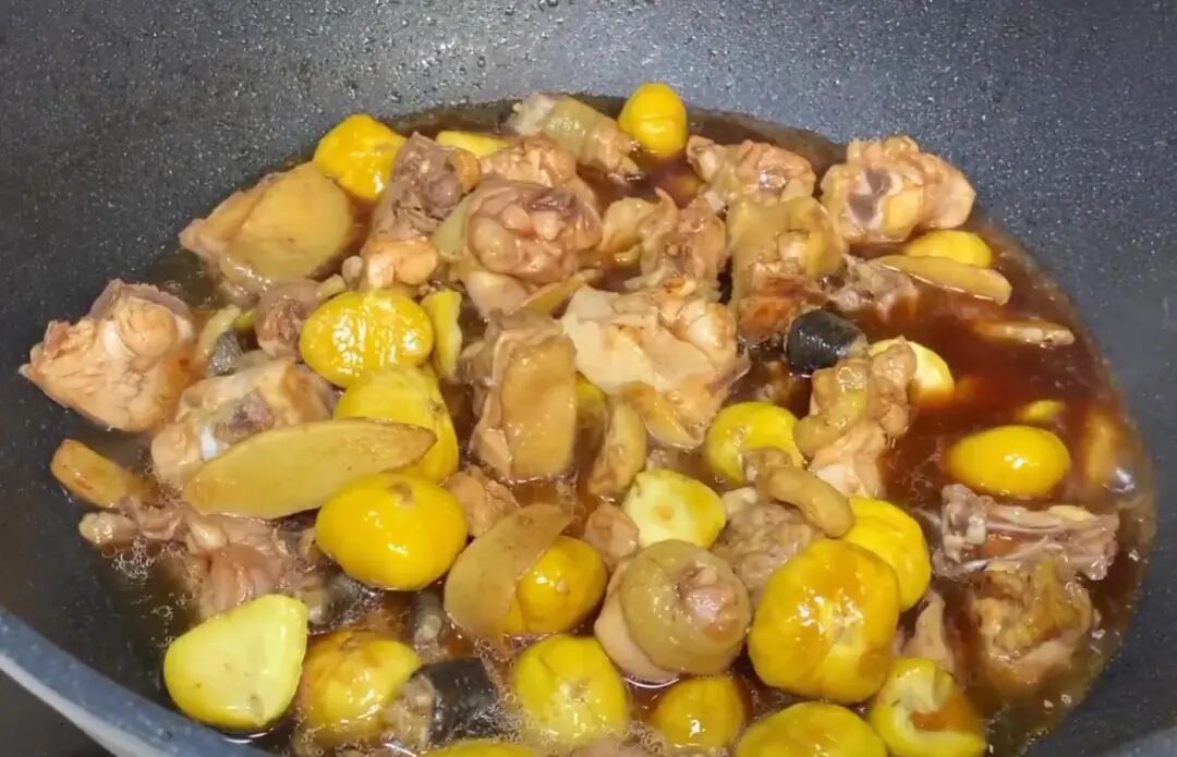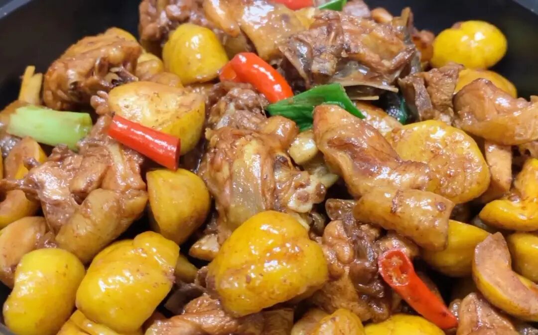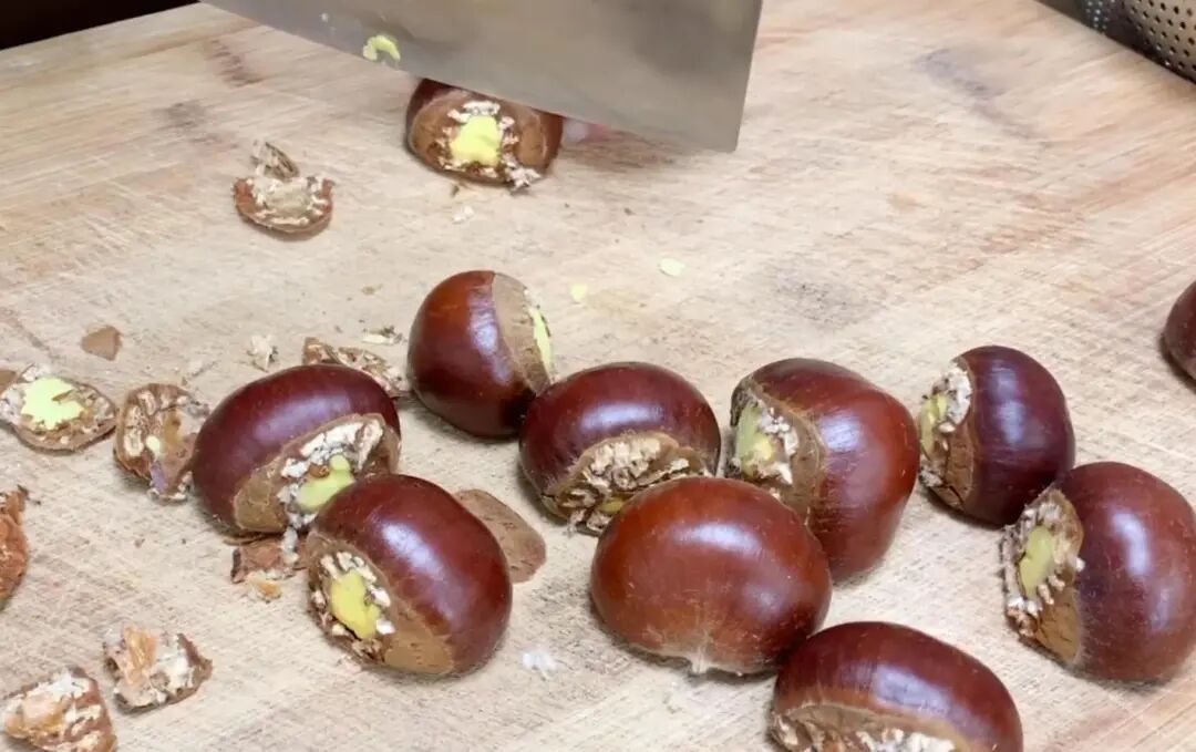 今天给大家分享一款很实用的板栗鸡做法,这样做出来的板栗鸡金黄诱人,板栗香甜软糯,鸡肉香而不腻,开胃又下饭。 做法; 1,准备好买回来的板栗从尾部用刀切下一块,这样比切十字刀快速还安全不容易切到手。 2,起锅烧水,水开后加一勺食盐,下入切好的板栗大火烧开煮3分钟,煮好之后先捞出一部分轻松剥皮,剩余的泡在水里,水分一干就不好剥皮了。 3,用这个方法可以轻松的去壳,手轻轻的一剥就下来,4斤的板栗用了不到10分钟就已经全部剥完了,如果一次吃不完可以装入保鲜袋中放入冰箱冷冻起来随吃随取。 4,准备好半只公鸡去掉淋巴和鸡屁股,剁成小块用清水浸泡10分钟,泡出血水再用流水冲洗干净。 5,起锅烧油下入板栗小火翻炒,炒过的板栗吃起来会更加的紧实,口感更好。 6,锅中再次倒入食用油下入姜片炒出香味,下入切好的鸡块快速翻炒,炒到鸡肉变色后加入料酒去腥,一点老抽上色,再加入生抽,食盐翻炒均匀。 7,倒入炒好的板栗翻炒均匀,倒入清水刚好没过鸡肉即可,盖上盖子大火烧开转小火炖30分钟。 8,30分钟后再加入一把切好的小米辣和蒜苗增香,快速翻炒均匀就可以出锅了,一道美味的板栗鸡就做好了,看着就有食欲,板栗香甜软糯,鸡肉香而不腻。