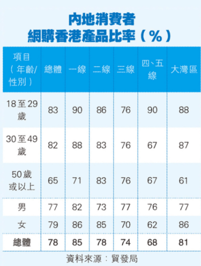 贸发局为了解内地消费者网购的情况,于今年8月委托市场调查机构,对内地网购消费者进行问卷调查。结果显示78%内地受访者过去一年曾网购香港产品,反映香港产品深受内地消费者欢迎。贸发局在今年8月举行第二届“香港好物节”,为港商提供实战机会,协助他们利用电商平台开拓内地市场。