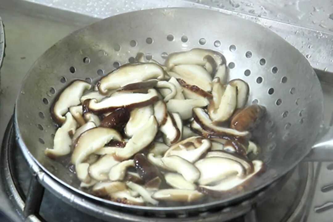 2.锅内烧水,加入食盐2克,淋入一点植物油,水烧开以后倒入香菇快速焯水30秒钟捞出,用清水冲洗干净。