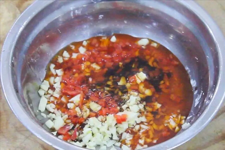 3.我们再做一下调料汁。大蒜拍扁后,切成蒜沫,红椒一小片,切成沫配色。倒入辣椒红油,芝麻香油,生抽,搅拌均匀后,浇在芹菜叶上。
