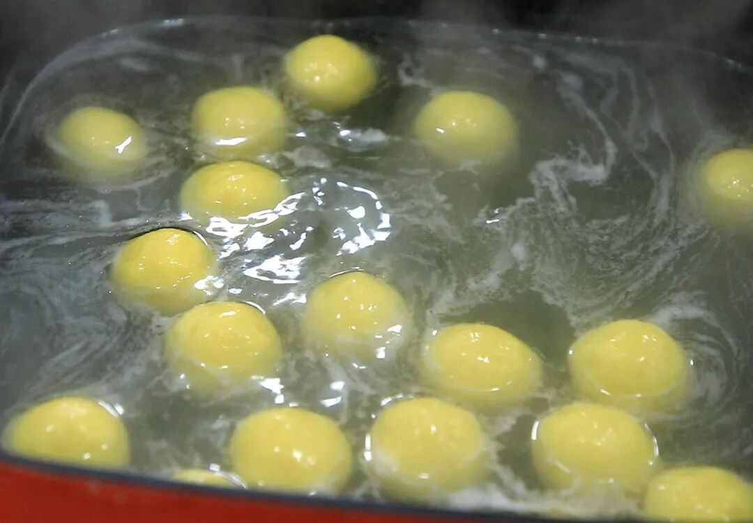 4.锅内烧水,水烧开以后下入红薯丸子,盖上锅盖煮5分钟就可以,煮熟以后放入盘中。