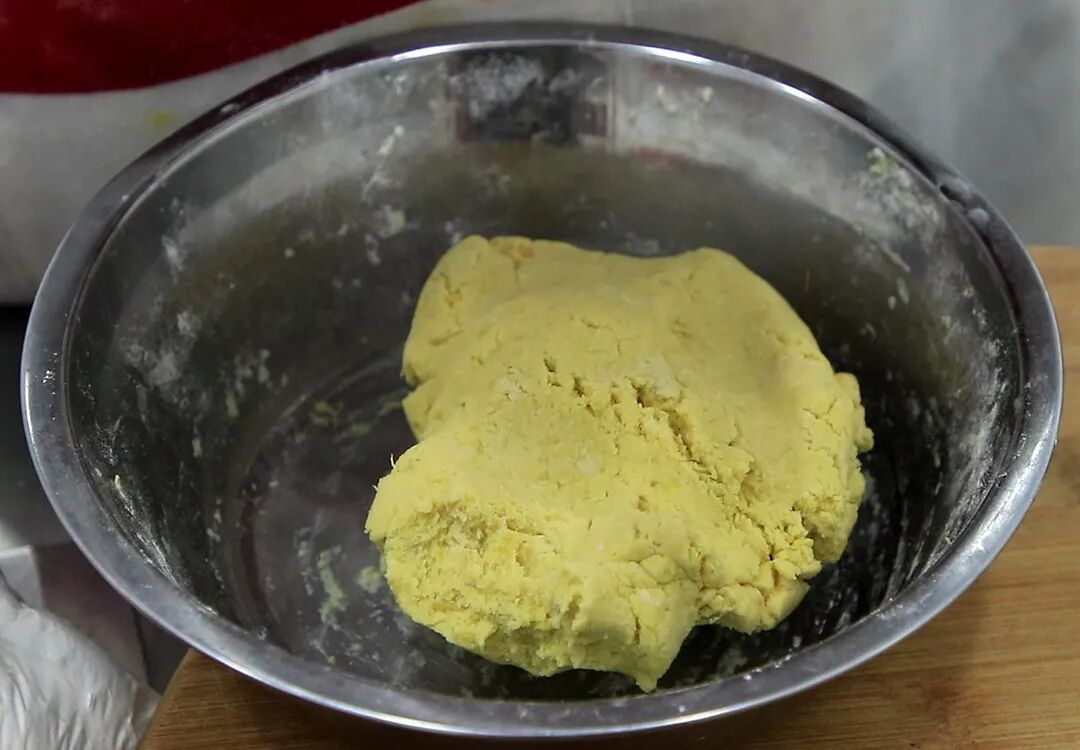 2.红薯蒸熟以后取出放在盆中,加入白糖20克增加甜度,用勺子按压成红薯泥,加入糯米粉50克,用手团成红薯团,这个面团比较松散不需要揉搓,团成一个红薯面团就可以了。